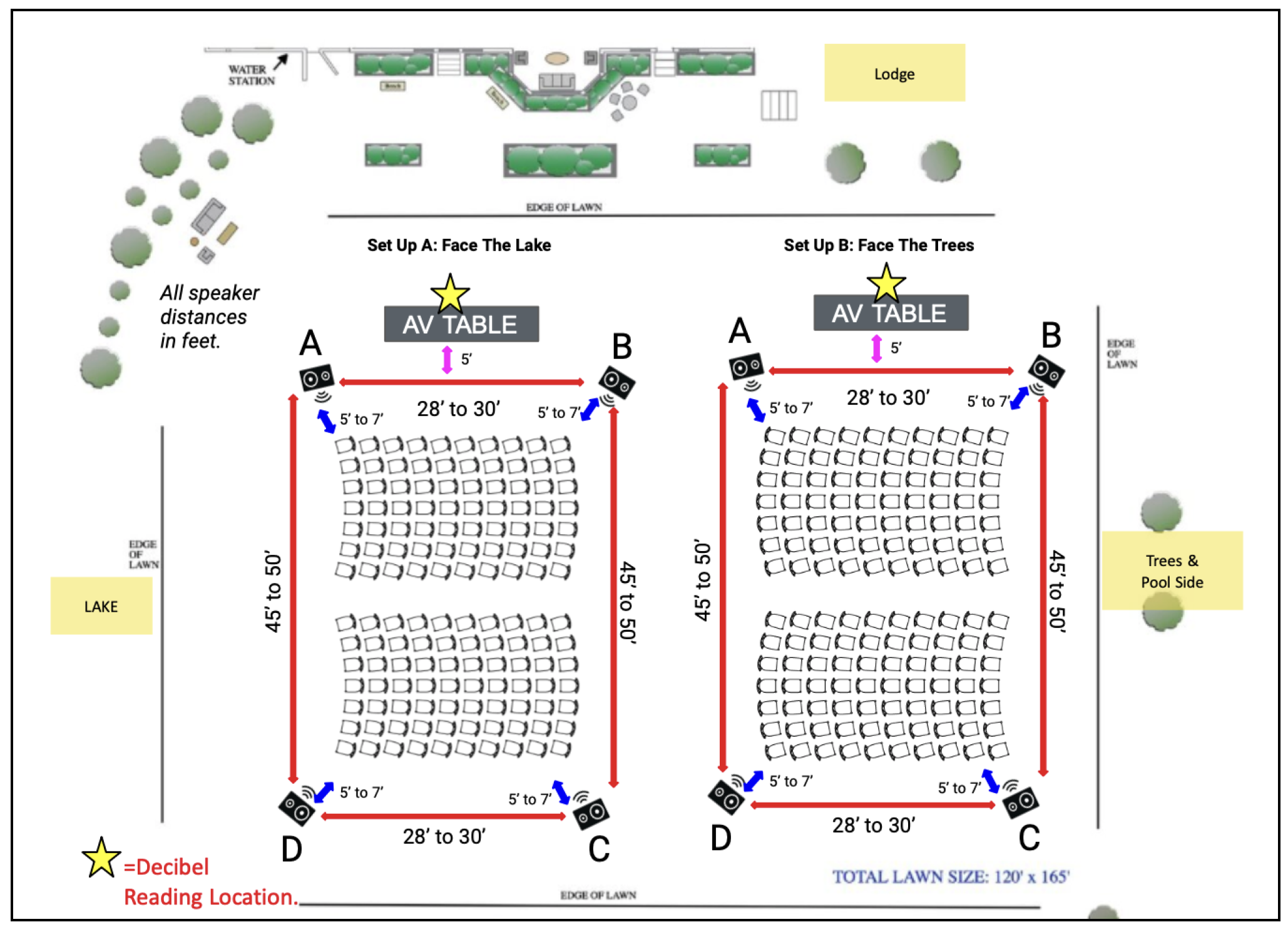 ● No less than 6 music speakers are required for dinner events seating outside. If only ambient music is being played and no microphones are needed, 4 speakers can be used by eliminating “C” and “D” from the equipment layout below. If microphones are being used, 6 speakers are needed for guests in the middle of the space to hear the microphone while staying within the guidelines.