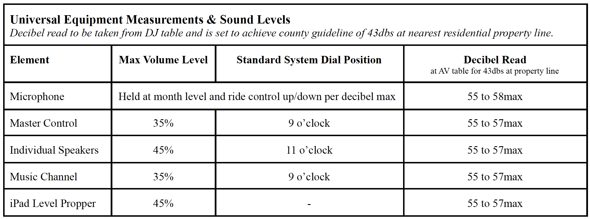 ● Decibel measurements shall be taken from the AV table and shown to the venue manager prior to event start.